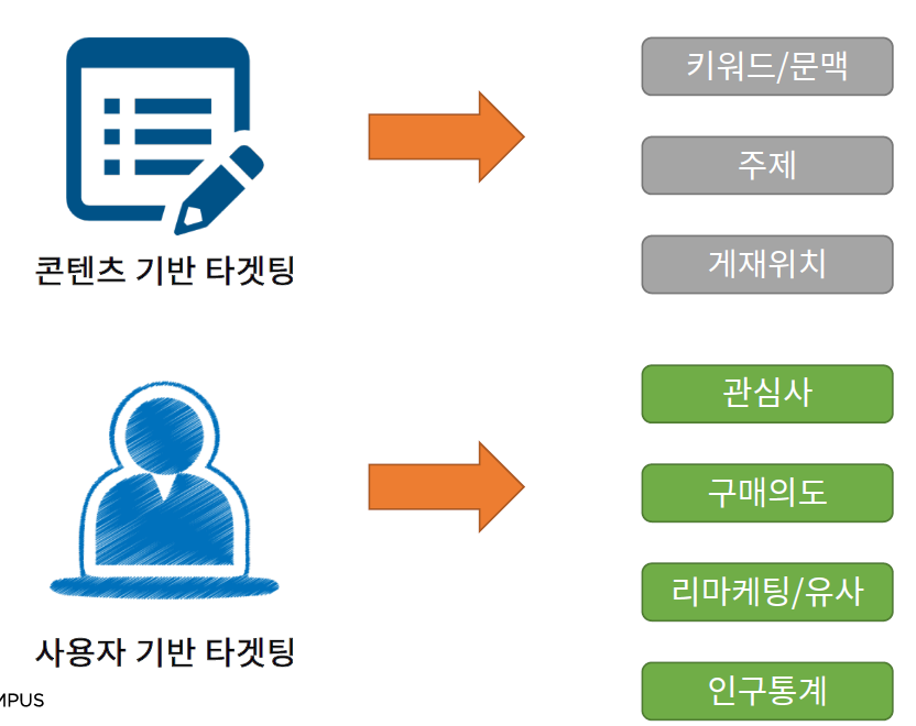 사용자 기반 타기팅은 콘텐츠 기반 타기팅과 달리 사용자의 행동 중심의 타기팅으로 관심이 어디에 있나? / 무엇을 구매하려 하나? / 어떤 행동을 했던 사용자인가? 와 같은 사용자의 행동을 바탕으로 타기팅 하는 방식.