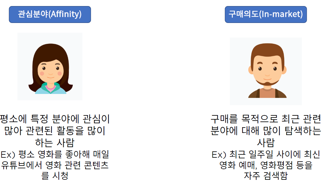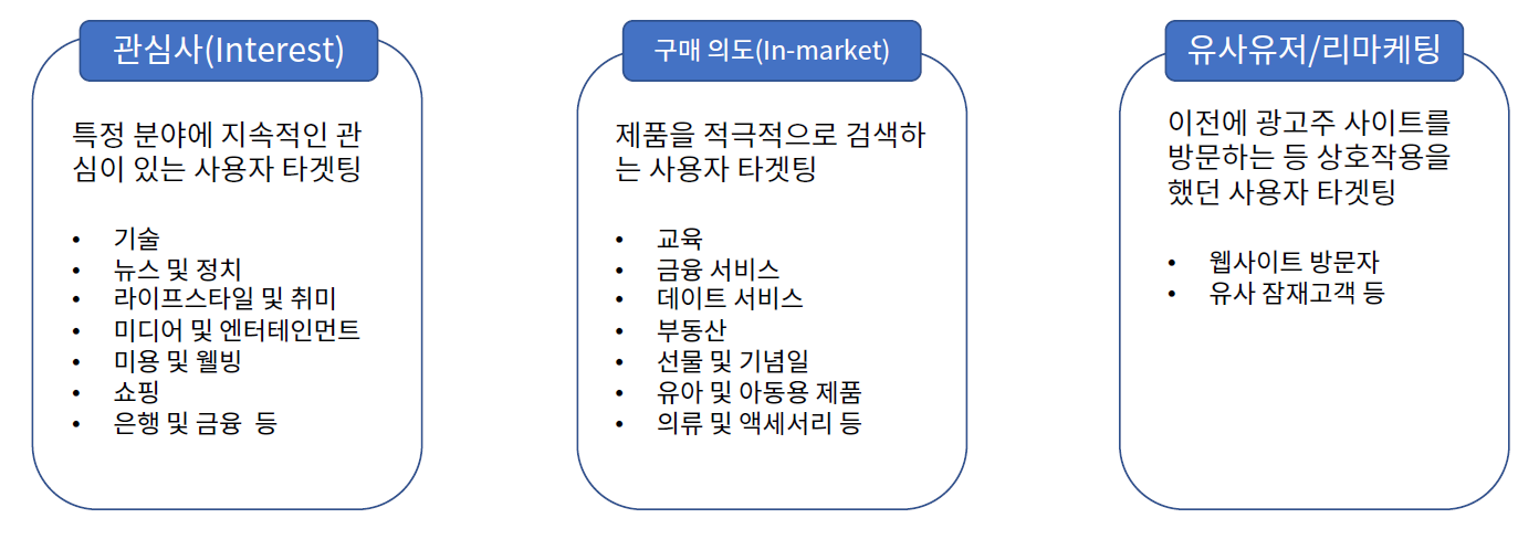 구매의도 타기팅의 경우 사용자가 적극적으로 검색을 했던 카테고리를 타기팅 하는 방식으로 GDN 광고에서는 고려 & 전환 목표의 광고에서 많이 활용되고 있는 타기팅