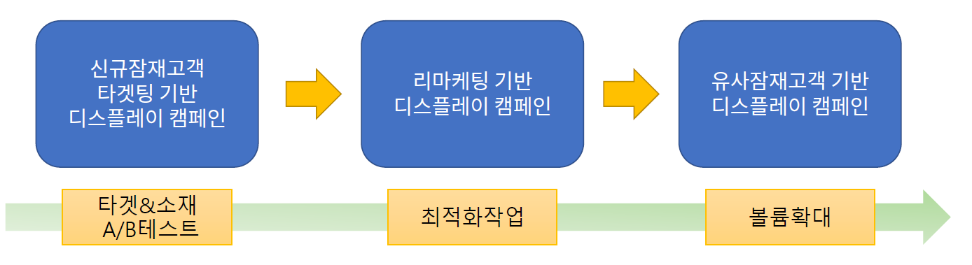 신규 캠페인을 운영하면서 타깃과 소재에 대한 A/B테스트를 통해 효율이 높은 잠재고객과 소재를 찾아내고 그것을 바탕으로 최적화 작업을 통해 유사 잠재고객까지 캠페인 볼륨을 키워나가는 과정이 디스플레이 캠페인 운영의 핵심이라고 할 수 있음.