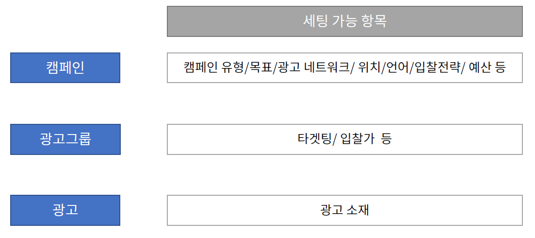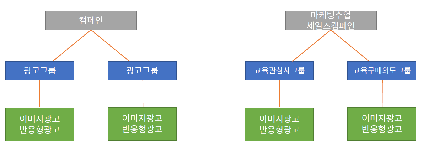 캠페인은 목적이나 큰 카테고리별로, 광고그룹은 상품별이나 타기팅 별로 나누는 것이 효과적.