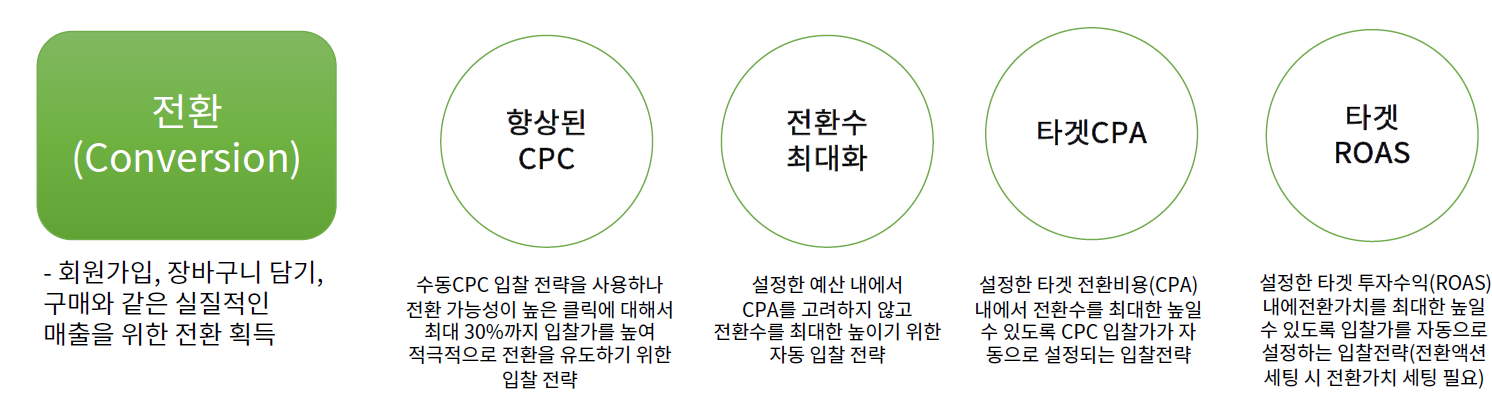 전환을 위한 입찰방식은 머신러닝에 의해 전환 최적화가 되는 입찰전략. 최소 1-2주 정도의 학습 기간이 필요하고 전환 트래킹 활성화 필수.