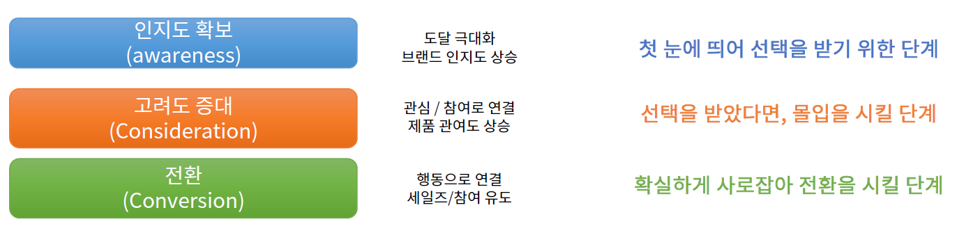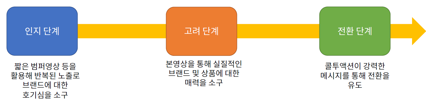 영상 캠페인은 고객의 구매 여정의 윗 단계를 주로 공략하는 광고로 단계별 영상 광고를 통해 시청자에게 브랜드를 인지시키고 퍼널 아래 단계까지 견인하는 역할을 하는 광고로 각 단계마다 고객을 공략해 나가야 함.