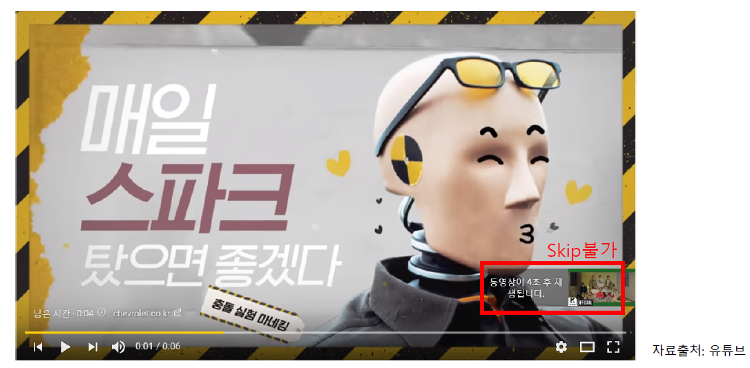 유튜브 영상 콘탠츠 시청 시 영상 시작 전에 나오는 5초 skip 가능한 프리롤 동영상 광고 상품