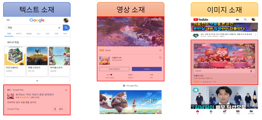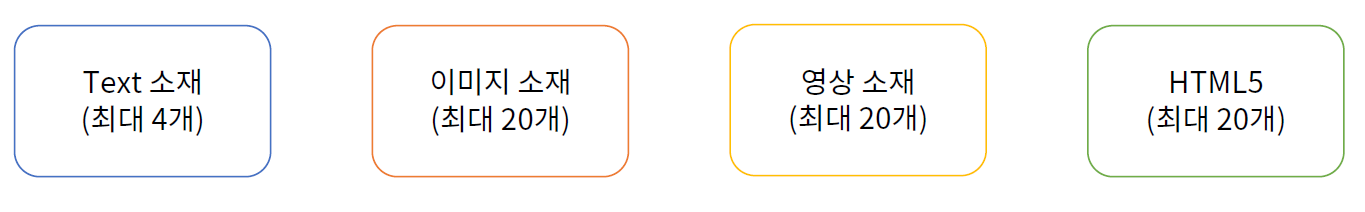앱 캠페인에서 소재는 텍스트, 영상, 이미지 소재 모두 활용 가능하며, 가능한 다양한 소재 활용을 적극 권장.