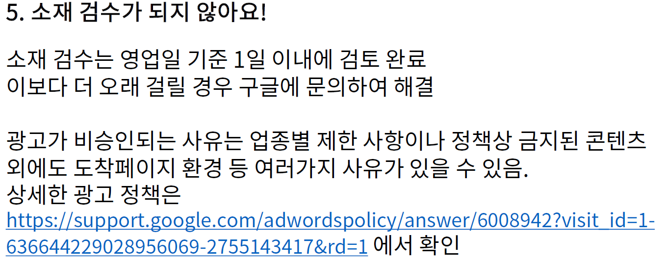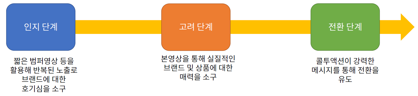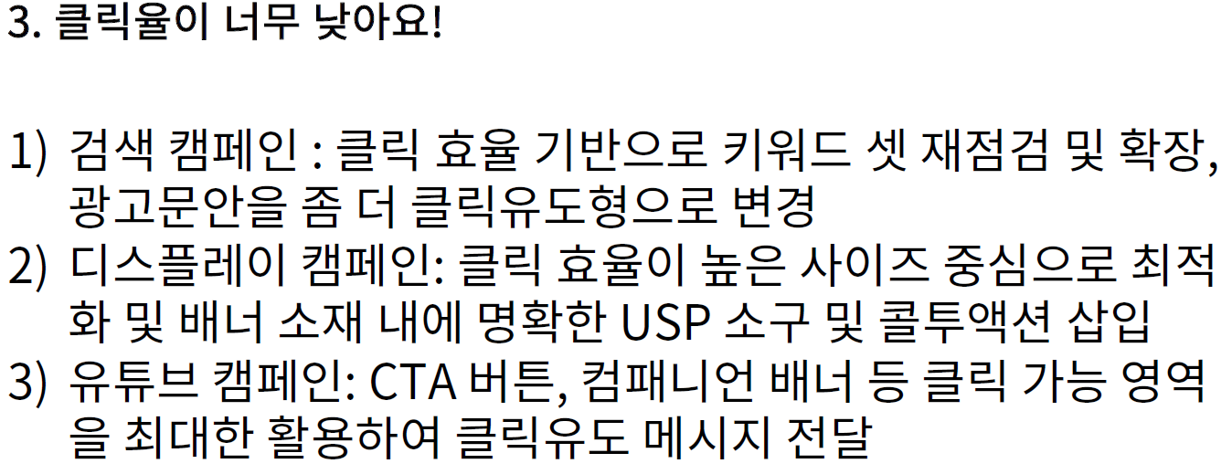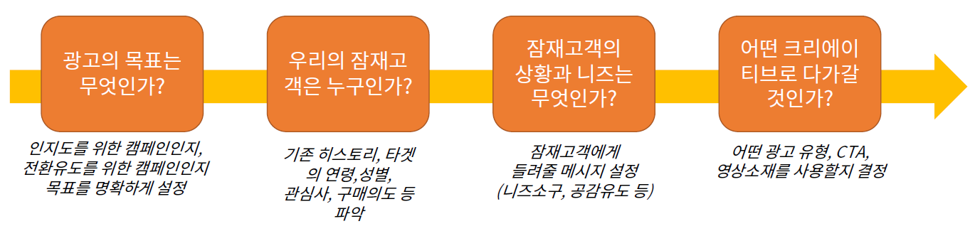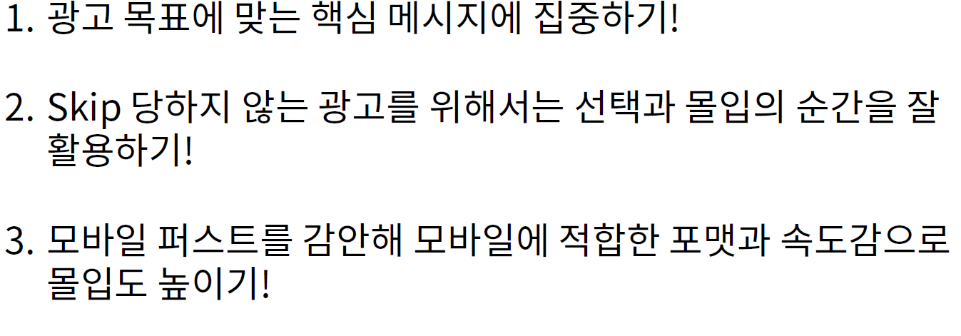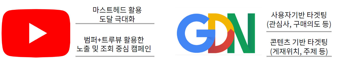 5. 광고 소재 : 광고 소재는 다양한 사이즈와 유형을 활용하되, 소재 효율 기반으로 최적화. 특히 유튜브 캠페인은 모바일향의 소재로 준비하는 것이 중요