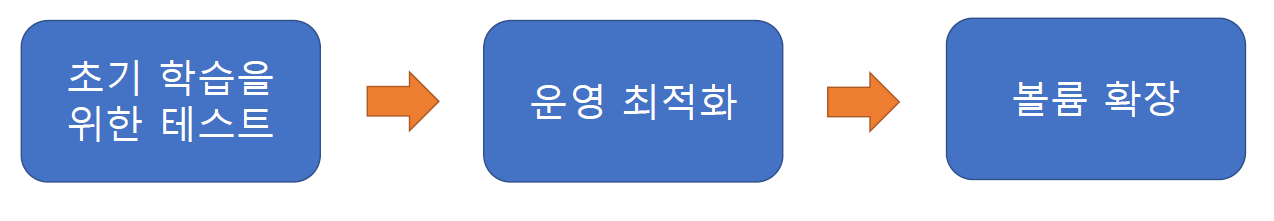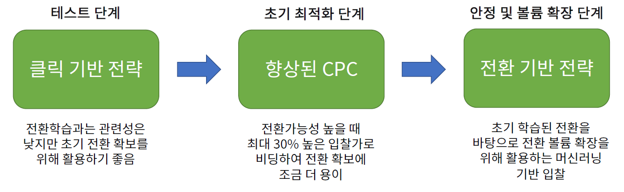 2. 입찰: 입찰 전략은 초기에는 학습과 상관관계가 적은 수동 CPC > 향상된 CPC > 타겟 CPA 순서로 캠페인을 최적화 시켜 나가고, 머신러닝을 고려 소폭 조정.