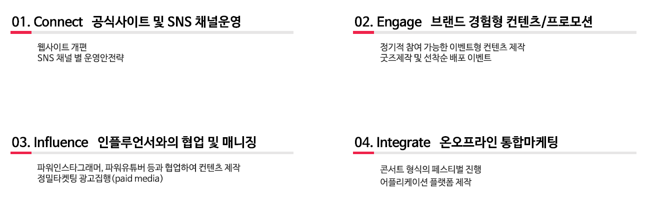 채널 별 특성을 살려 최적의 역할을 부여하고 각 콘텐츠 / 캠페인 운영방향을 분명하게 만들어 최적의 효과 유도